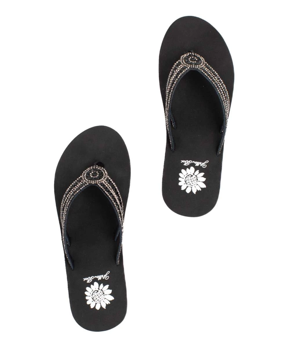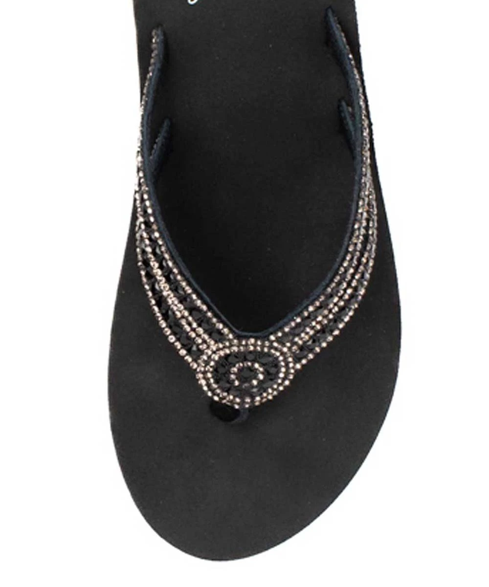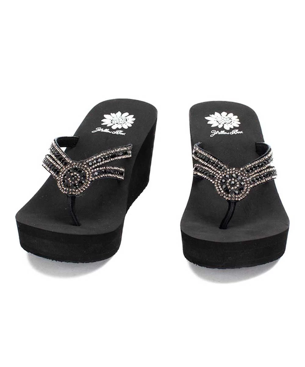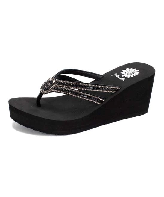 Chic wedge sandal featuring shimmering rhinestone accenting and a flexible rubber sole.