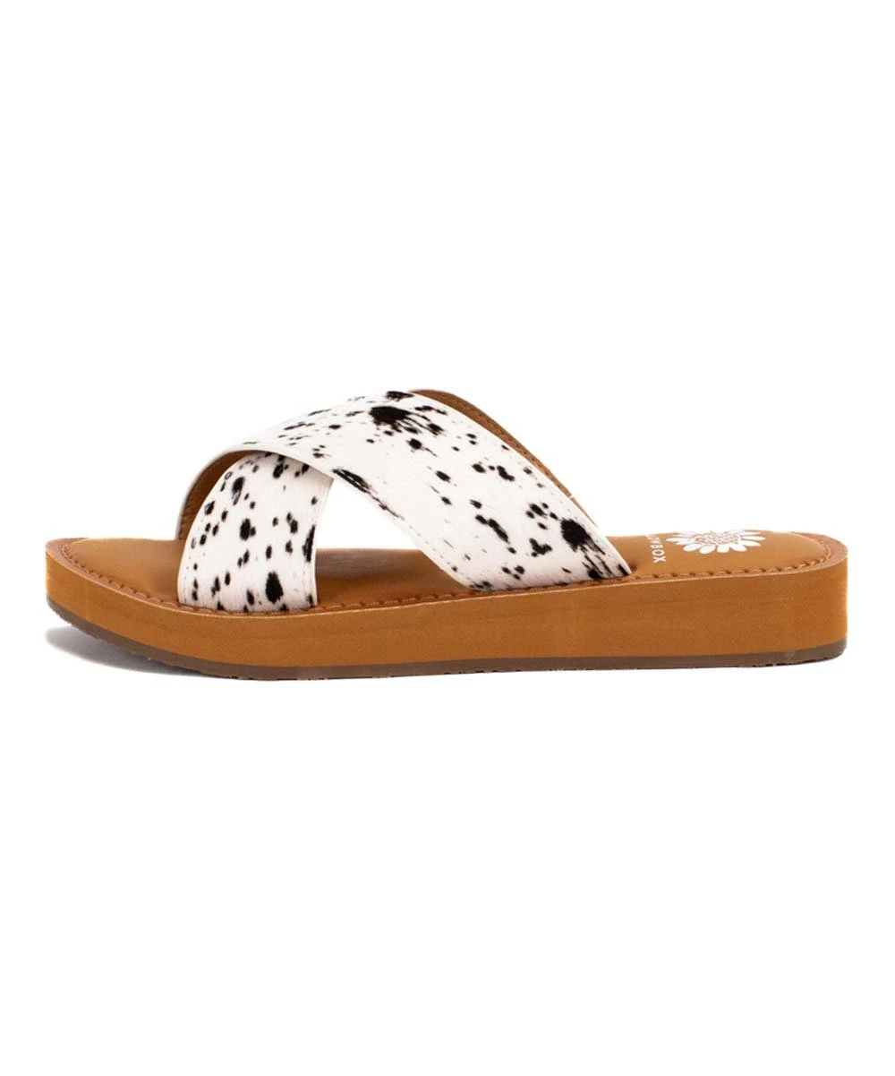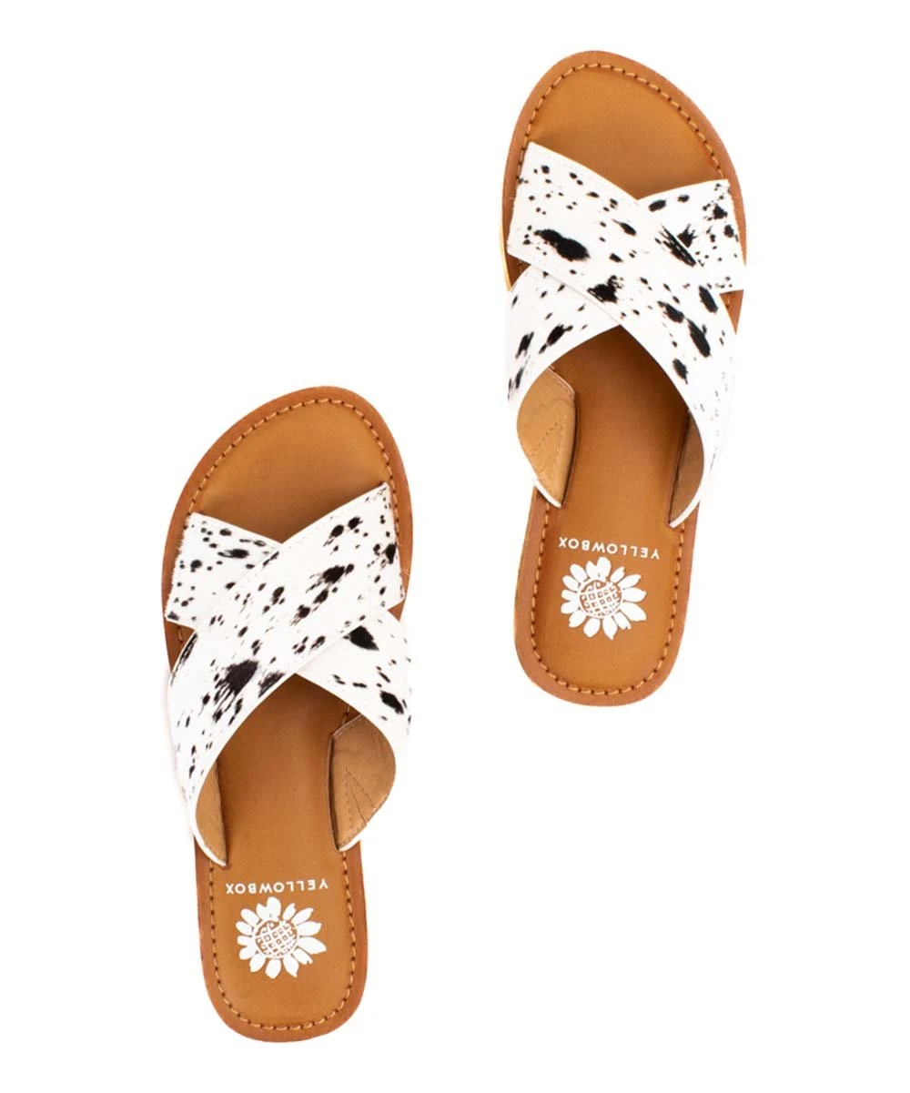 Leather slides featuring a chic crossed-strap design and flexible rubber sole.