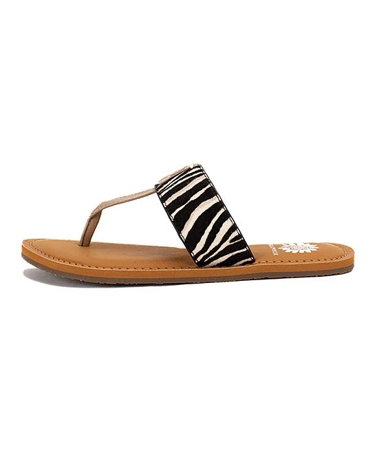 Stylish leather sandal featuring a wild zebra-print upper and easy slip-on design.