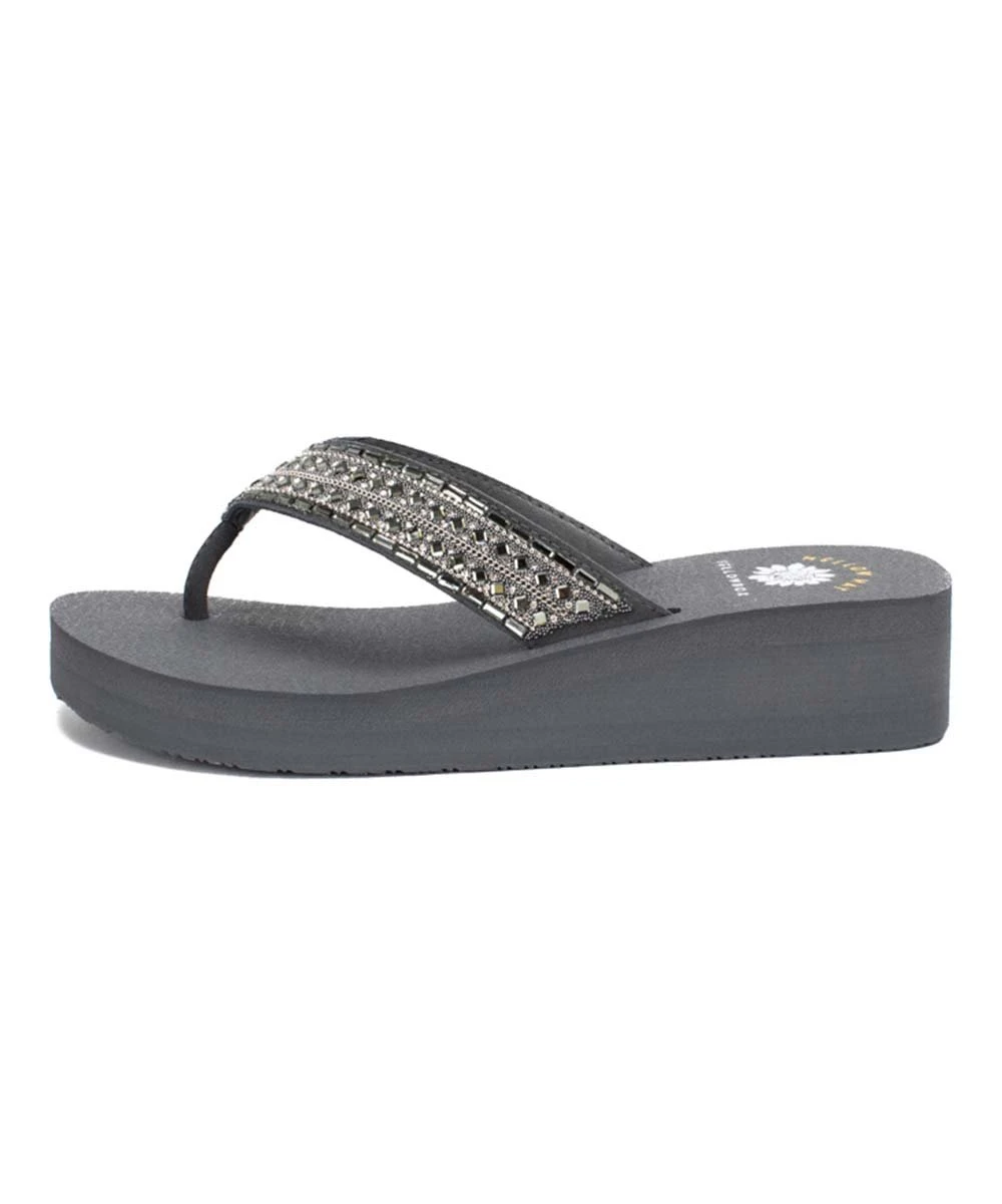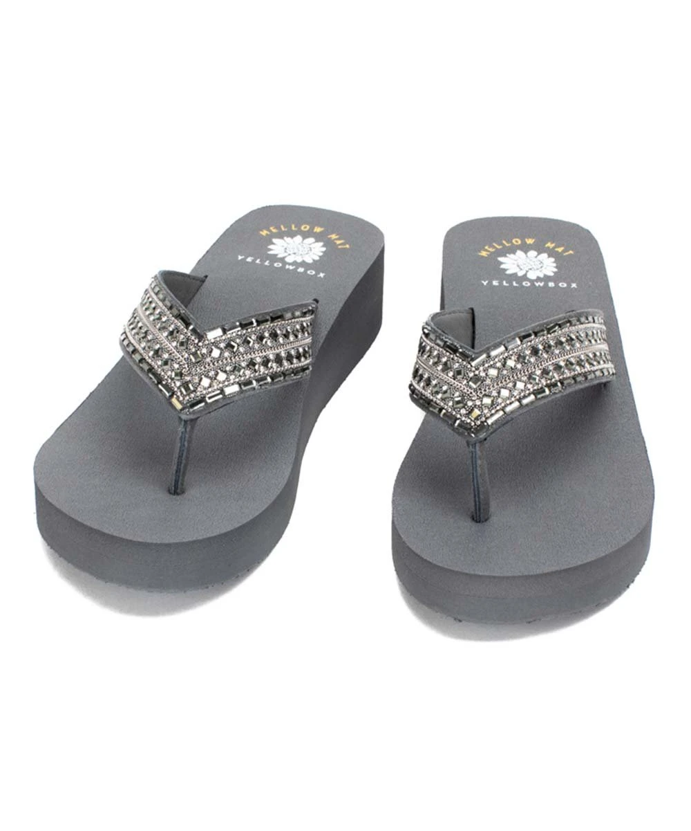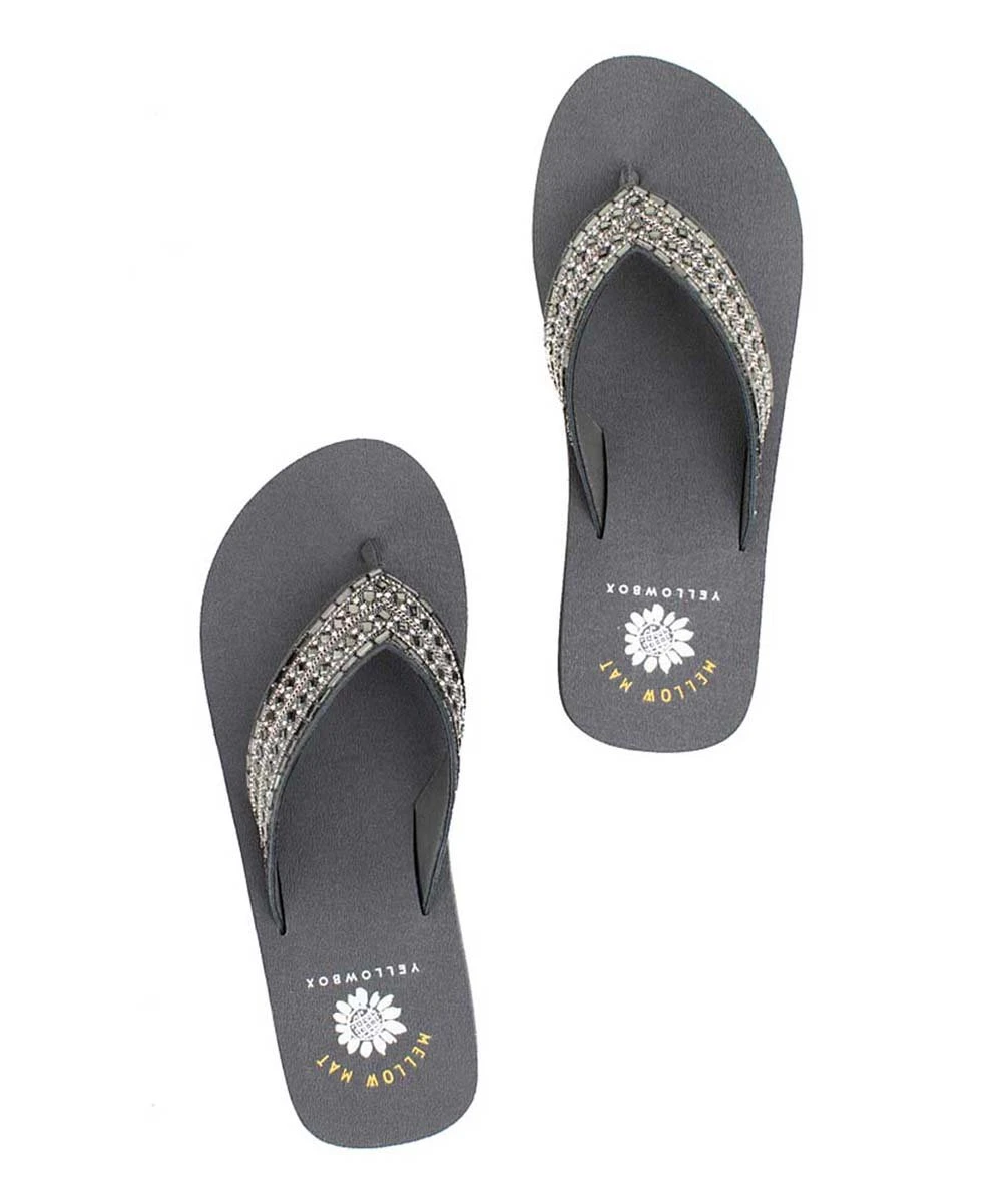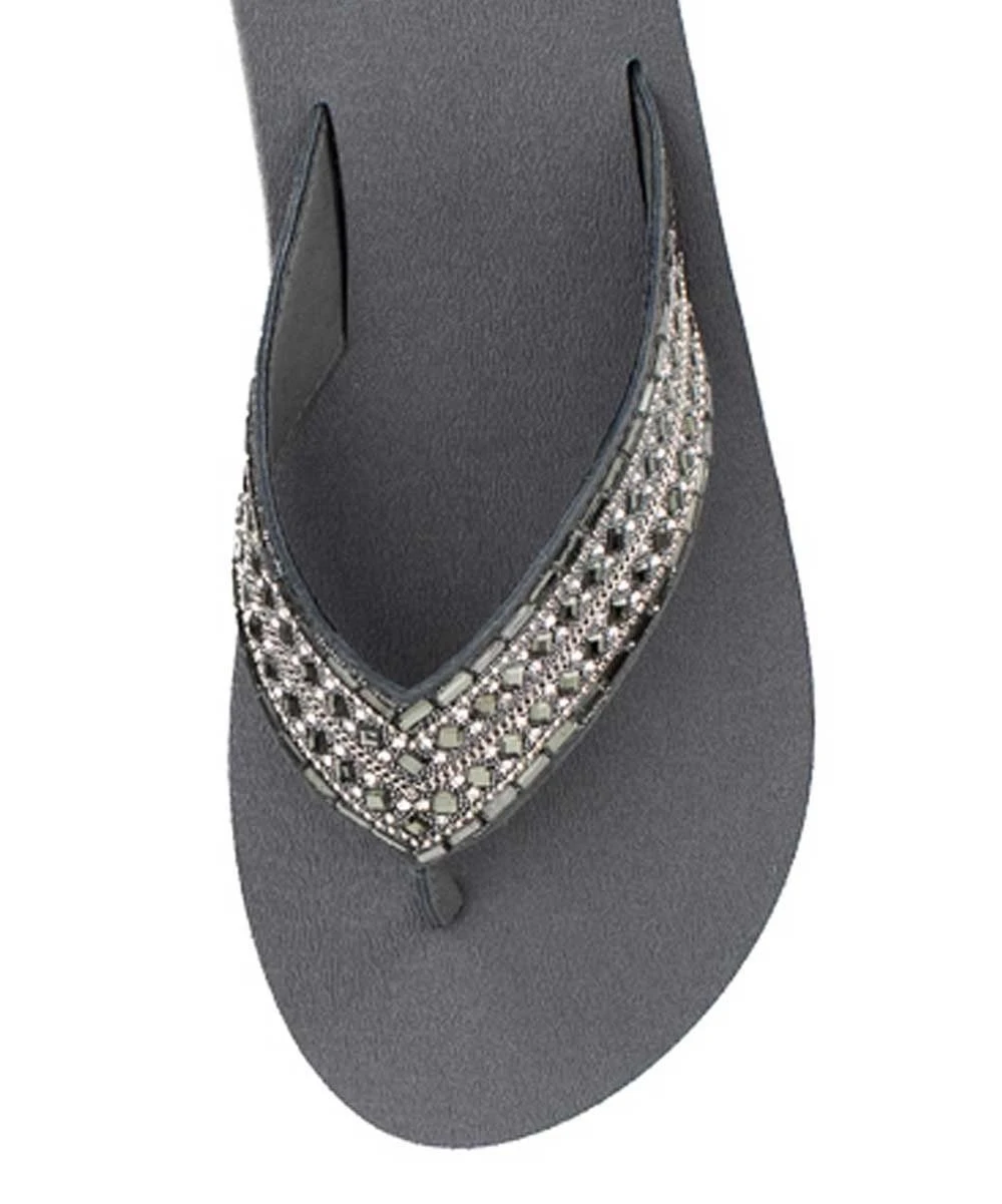 Shining slip-on sandal featuring rhinestone embellishments and a flexible rubber sole.