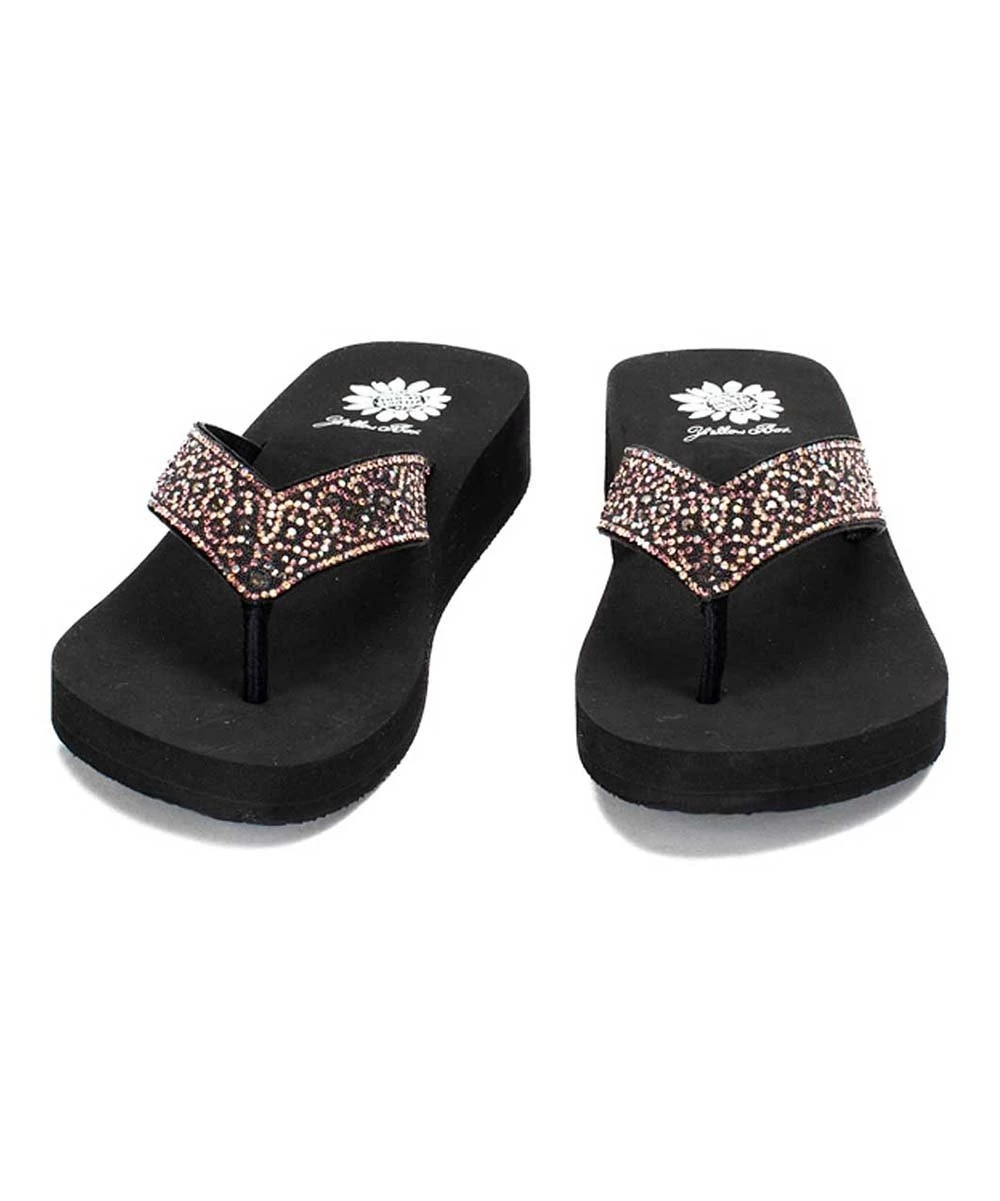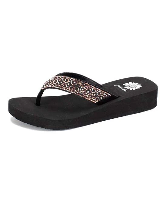 Shimmering rhinestone-embellished sandals featuring a leather upper and flexible rubber sole.