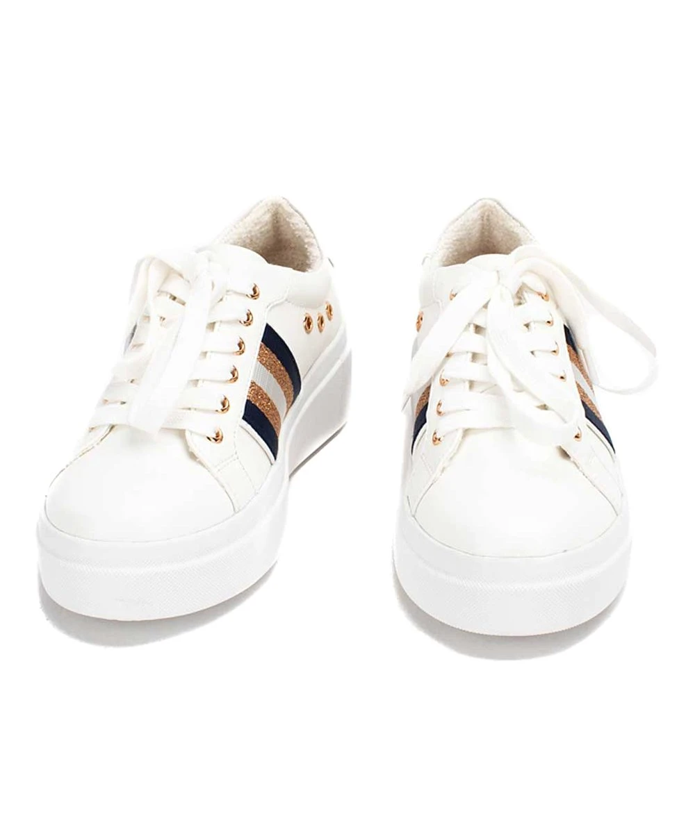Show off chic style with every step wearing this sneaker featuring a glitter stripe detail and metallic grommets. Padded footbed for added comfort.